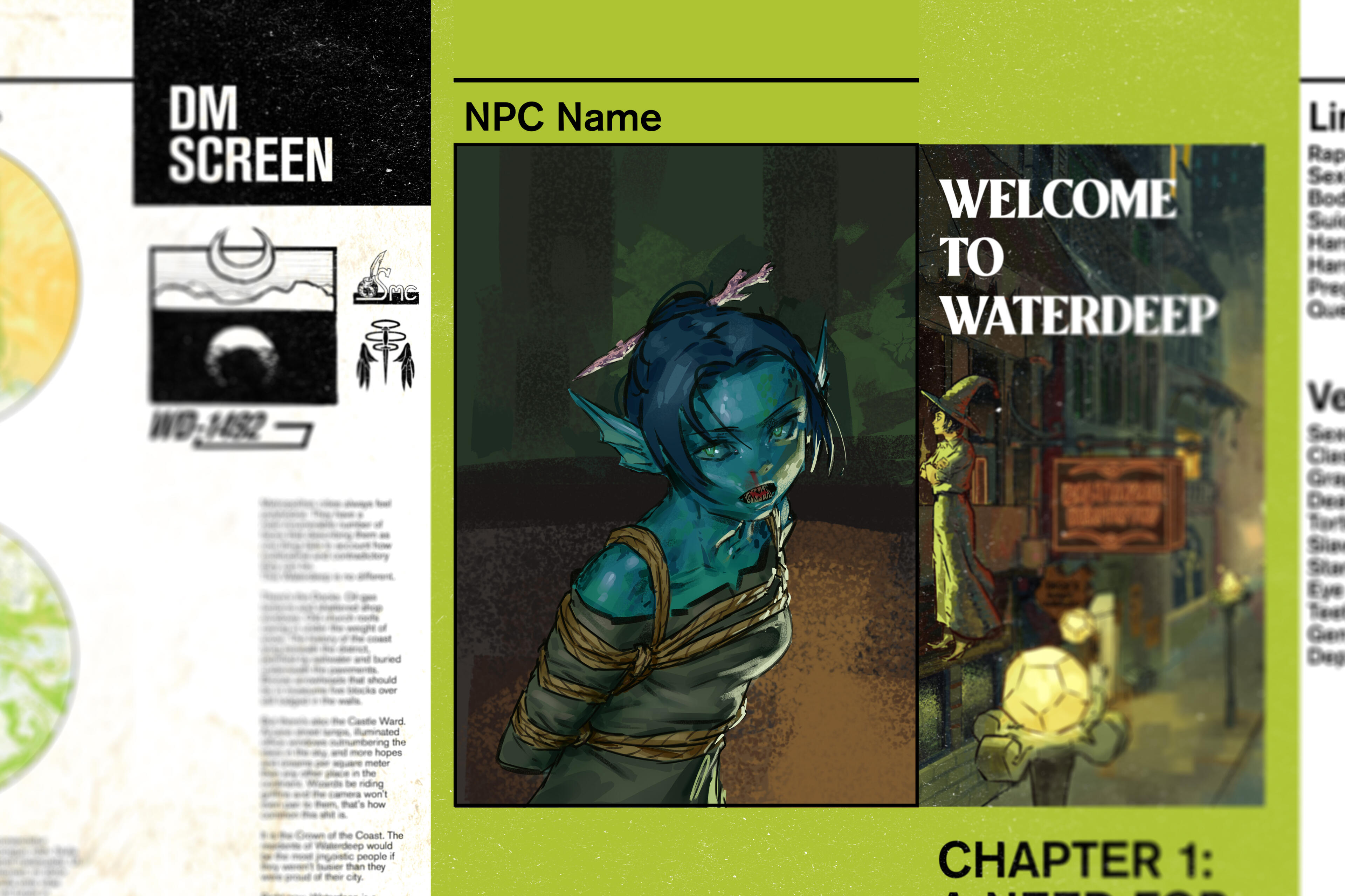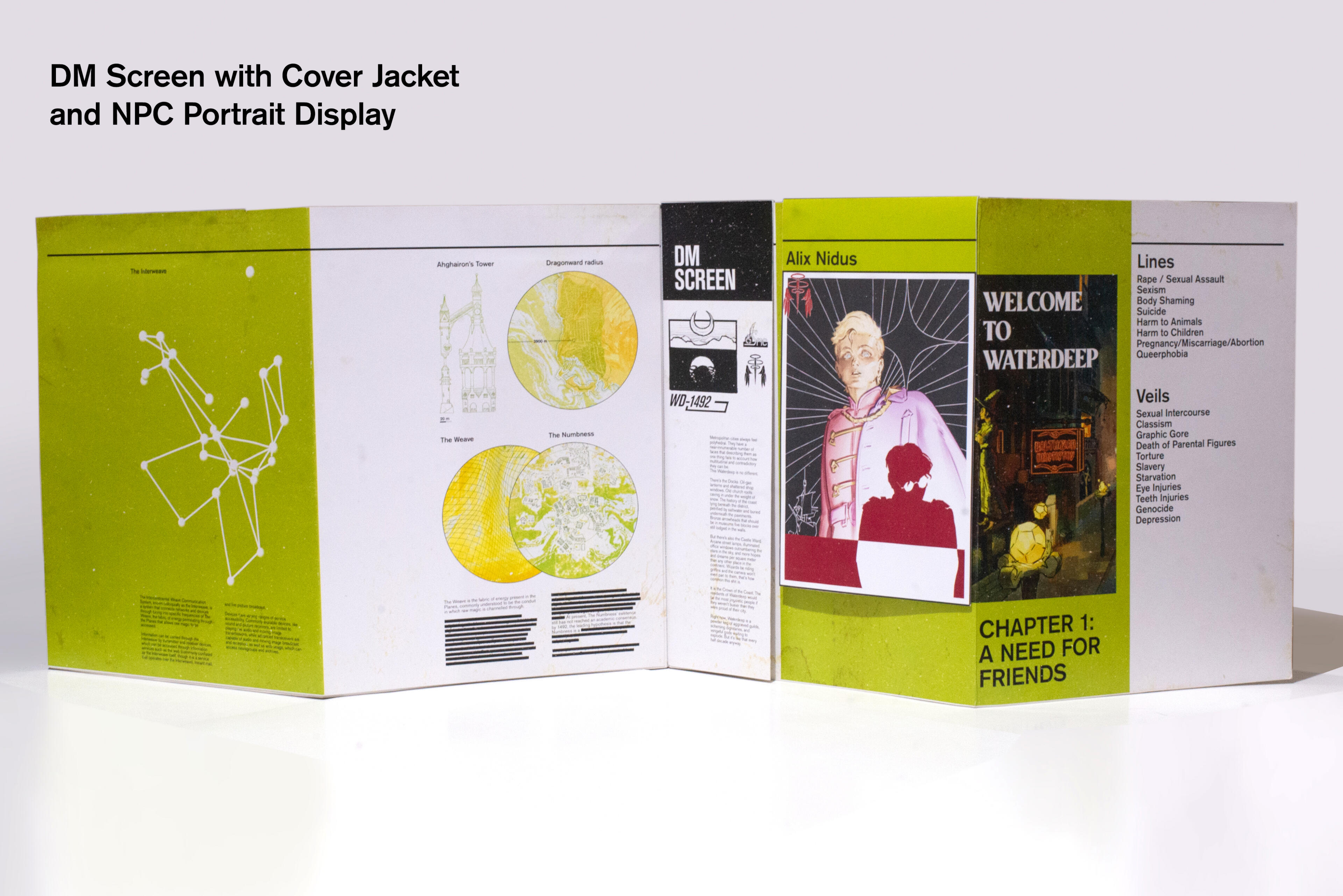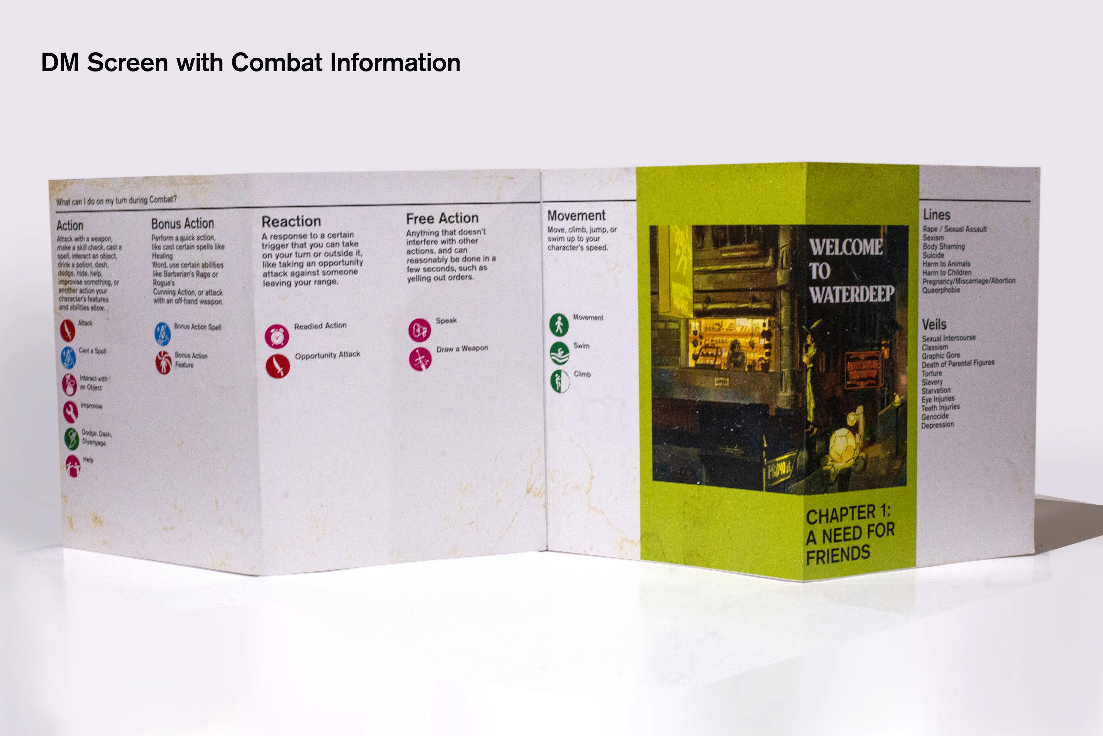 A Dungeons and Dragons DM Screen project with a modular design emphasized on displaying information and visuals to the players, such as NPC portraits, campaign information, and actions to take during combat.