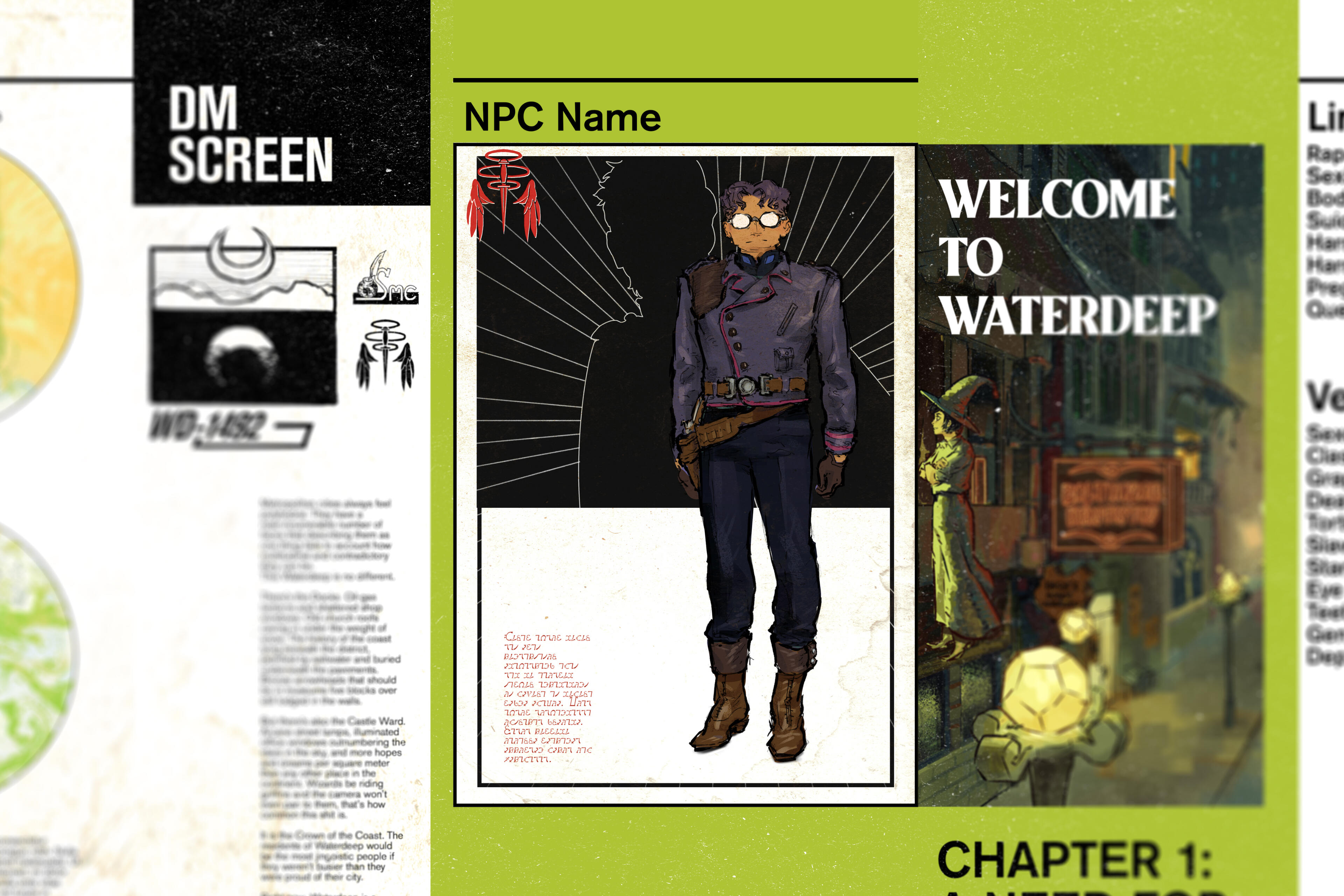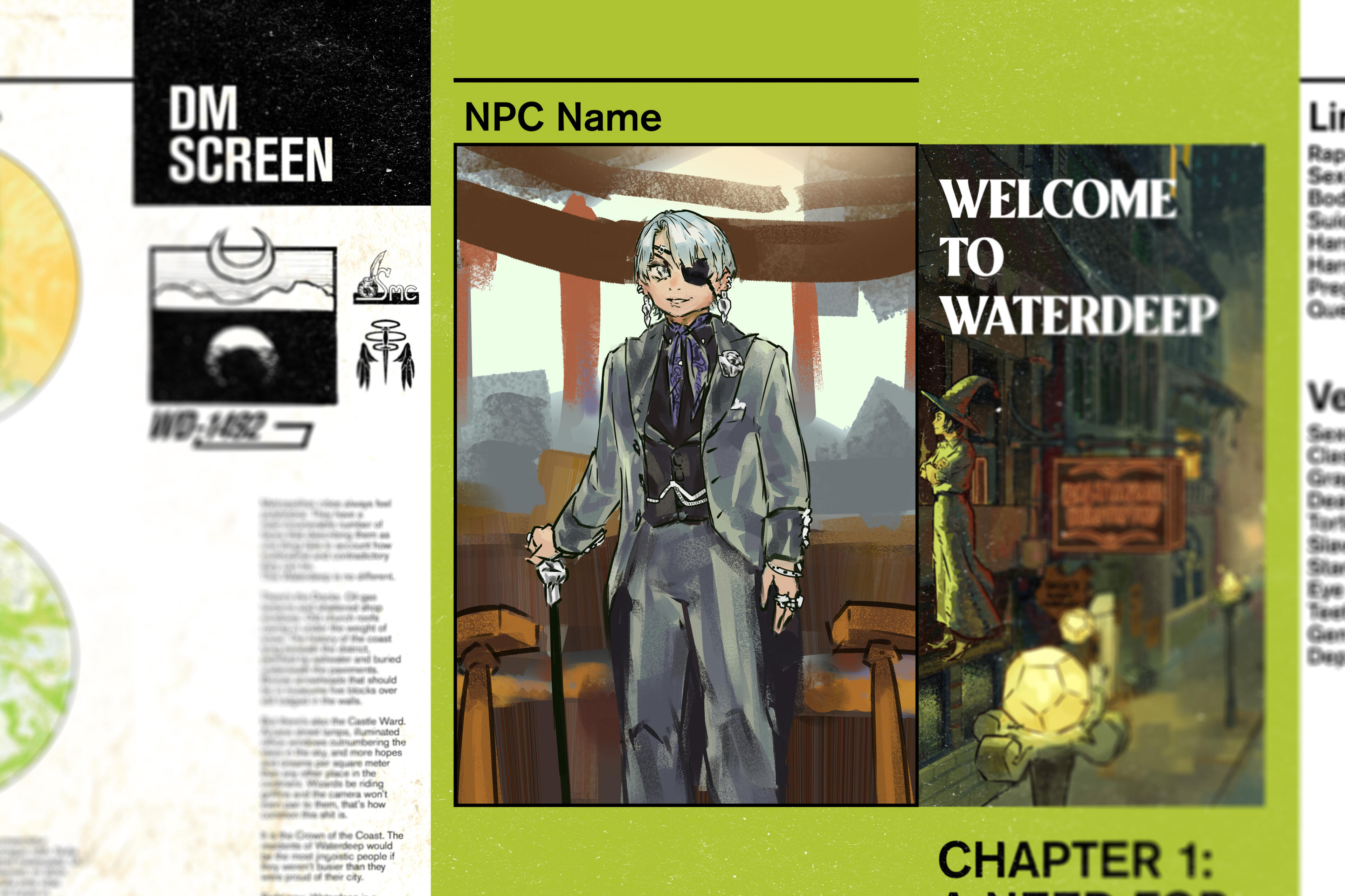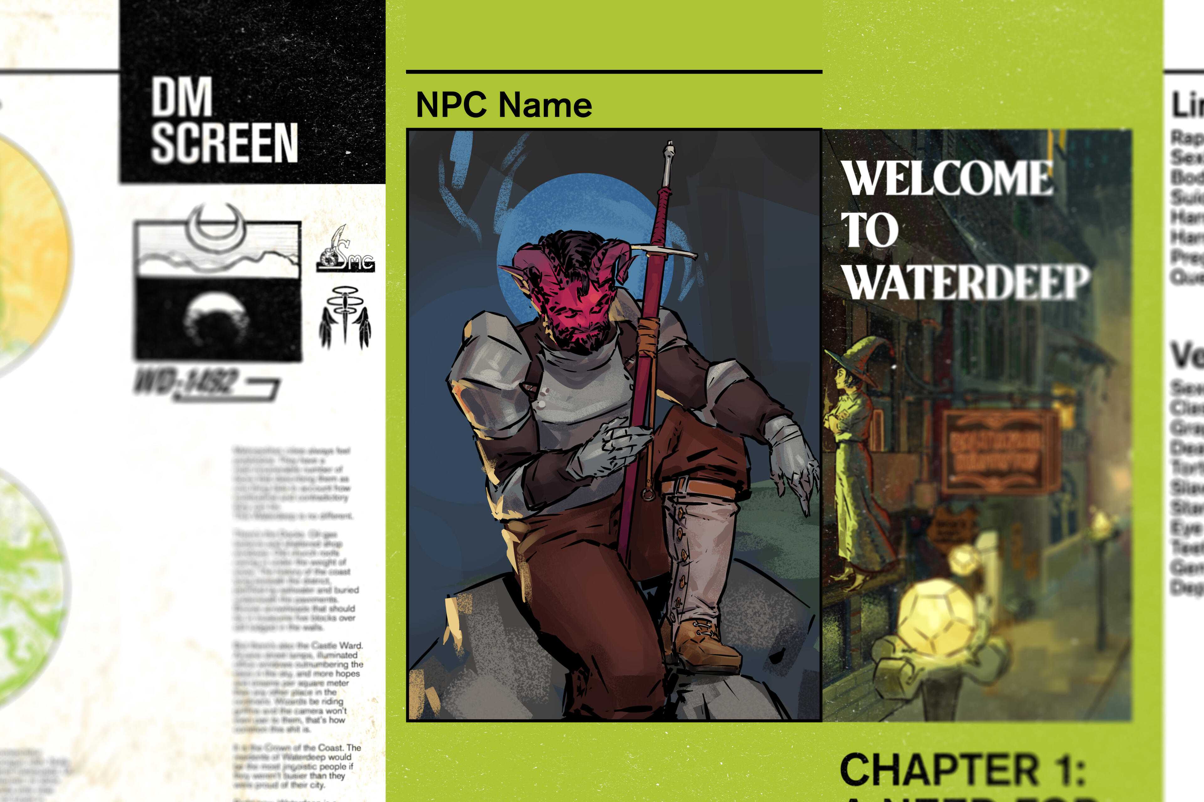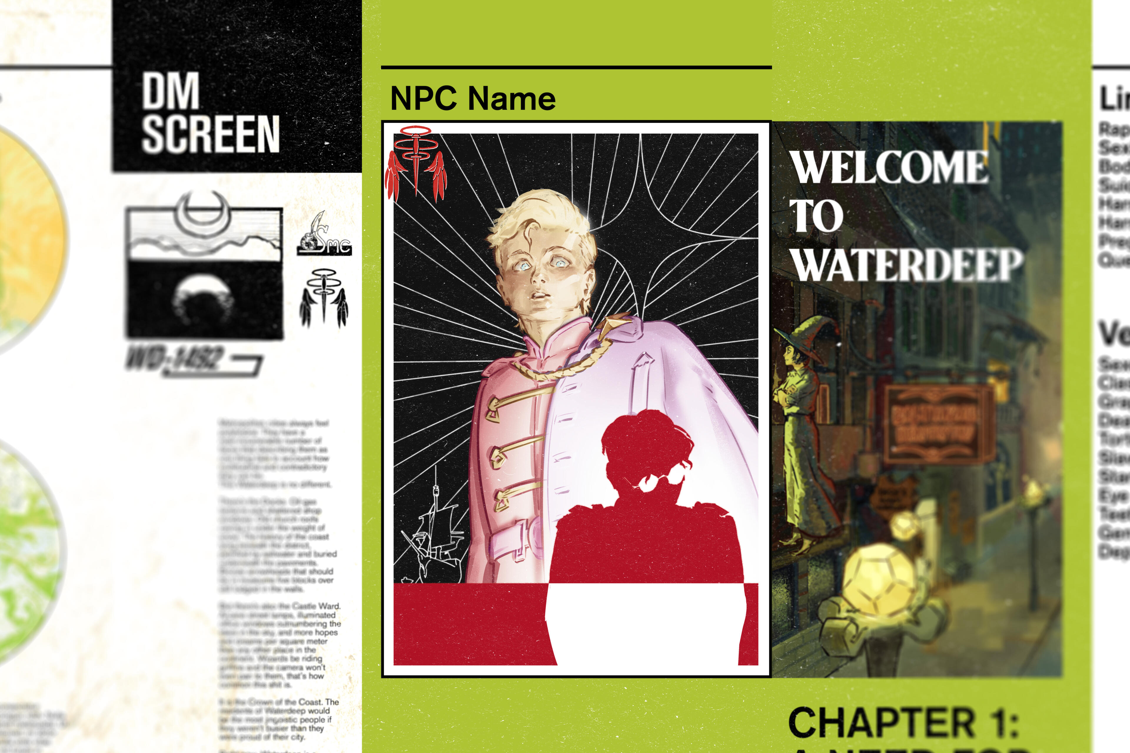 A Dungeons and Dragons DM Screen project with a modular design emphasized on displaying information and visuals to the players, such as NPC portraits, campaign information, and actions to take during combat.